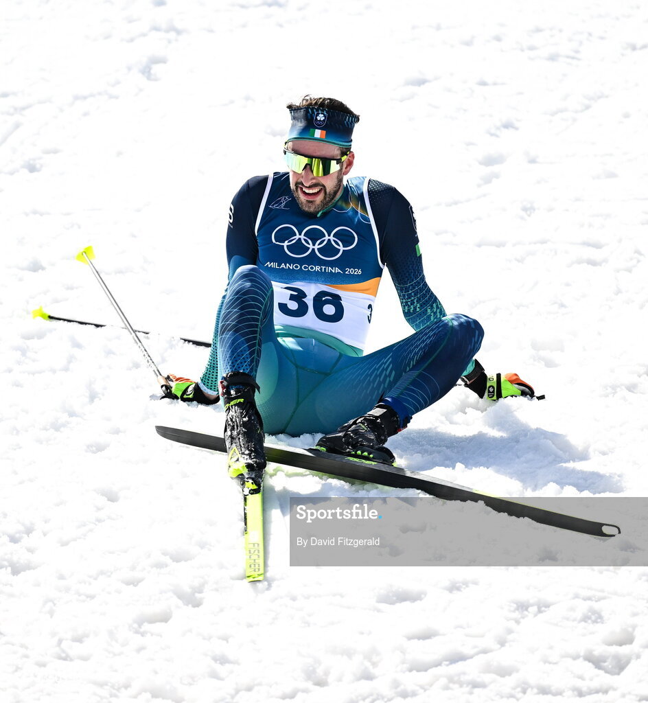 8 February 2026; Thomas Maloney Westgaard of Team Ireland after finishing the Men's Cross-Country Skiing 10km+10km Skiathlon Final during day two of the Milano Cortina 2026 Winter Olympics at Tesero Cross-Country Skiing Stadium in Val di Fiemme, Italy. Photo by David Fitzgerald/Sportsfile