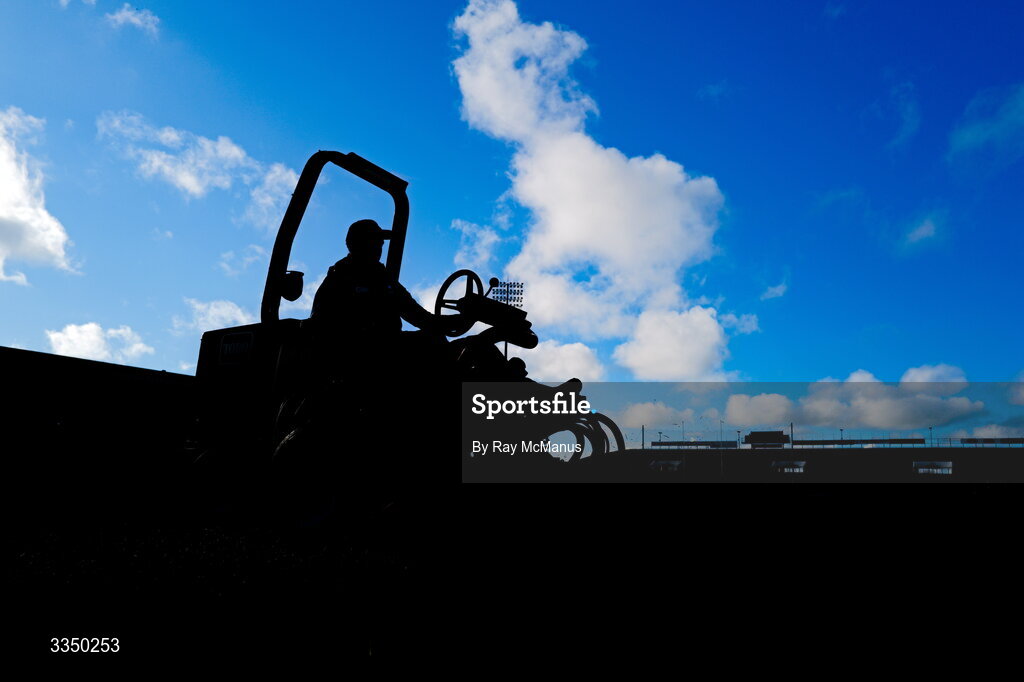 8 February 2026; Dan Owens, of Grene Sportsgrounds, cutting the grass before the Allianz Hurling League Division 1A match between Limerick and Kilkenny at TUS Gaelic Grounds in Limerick. Photo by Ray McManus/Sportsfile