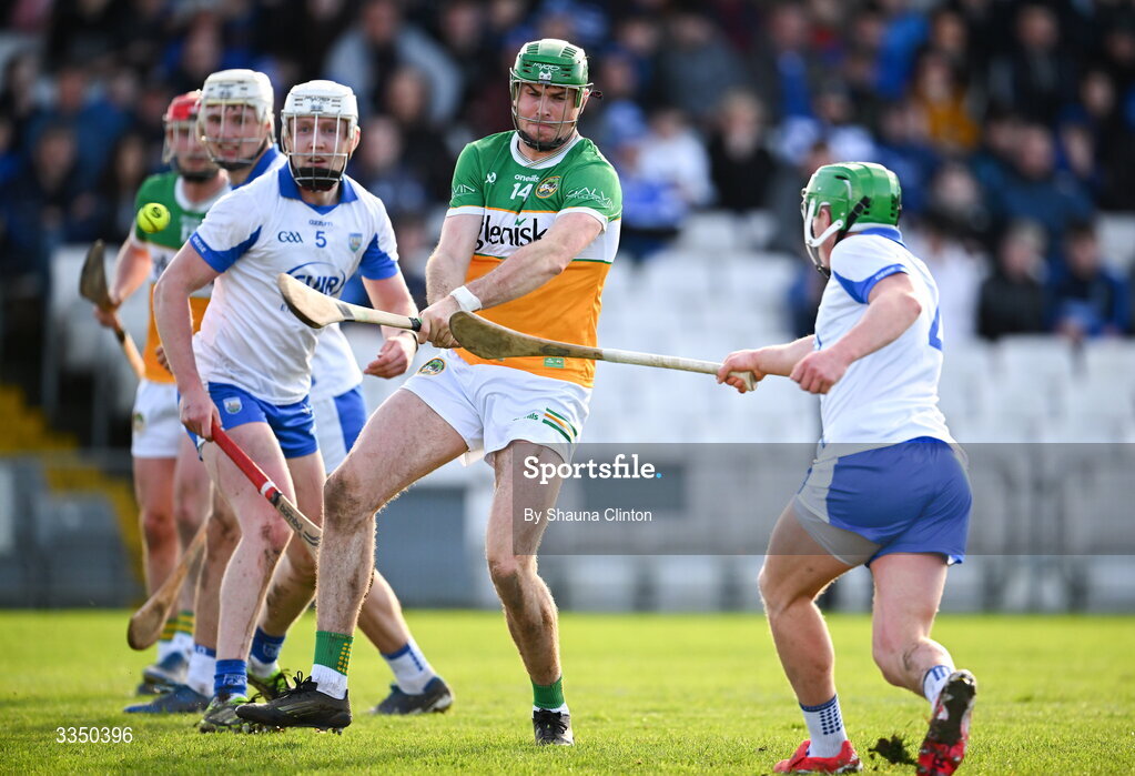 8 February 2026; Ross Ravenhill of Offaly has a shot on goal during the Allianz Hurling League Division 1A match between Waterford and Offaly at Azzuri Walsh Park in Waterford. Photo by Shauna Clinton/Sportsfile