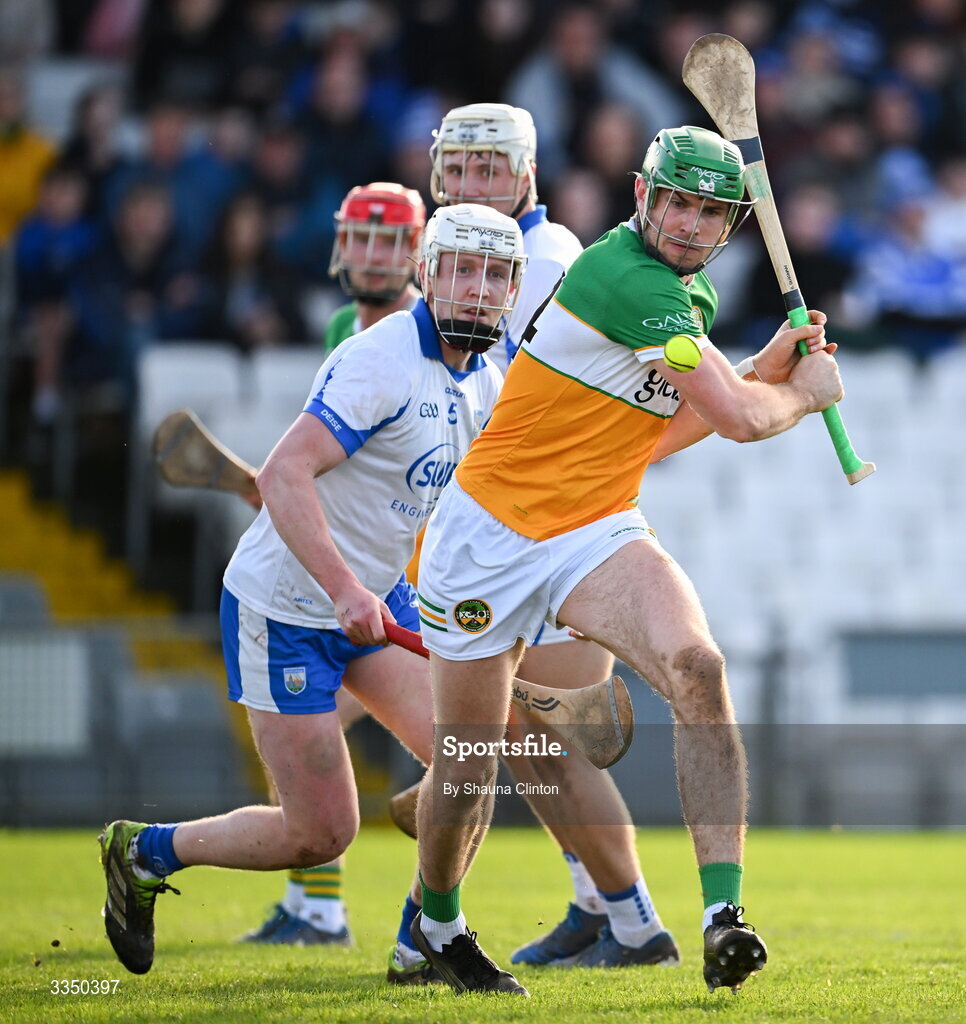 8 February 2026; Ross Ravenhill of Offaly has a shot on goal during the Allianz Hurling League Division 1A match between Waterford and Offaly at Azzuri Walsh Park in Waterford. Photo by Shauna Clinton/Sportsfile