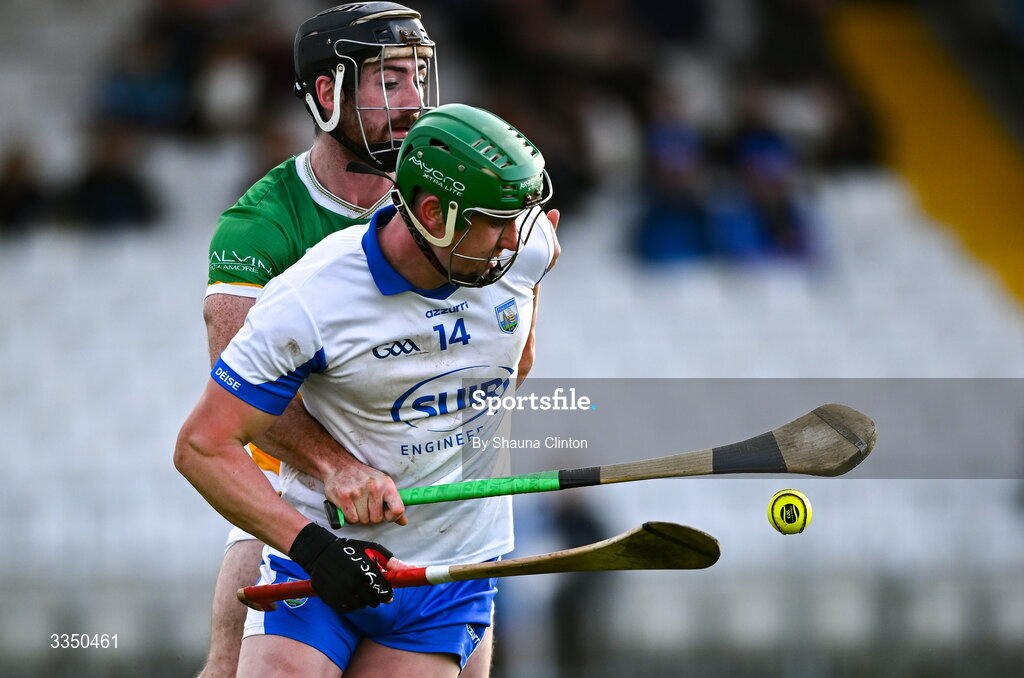 8 February 2026; Michael Kelly of Waterford is tackled by Ben Conneely of Offaly during the Allianz Hurling League Division 1A match between Waterford and Offaly at Azzuri Walsh Park in Waterford. Photo by Shauna Clinton/Sportsfile