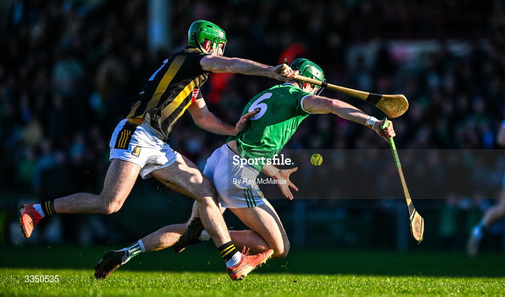 8 February 2026; William O'Donoghue of Limerick is tackled by Eoin Cody of Kilkenny during the Allianz Hurling League Division 1A match between Limerick and Kilkenny at TUS Gaelic Grounds in Limerick. Photo by Ray McManus/Sportsfile