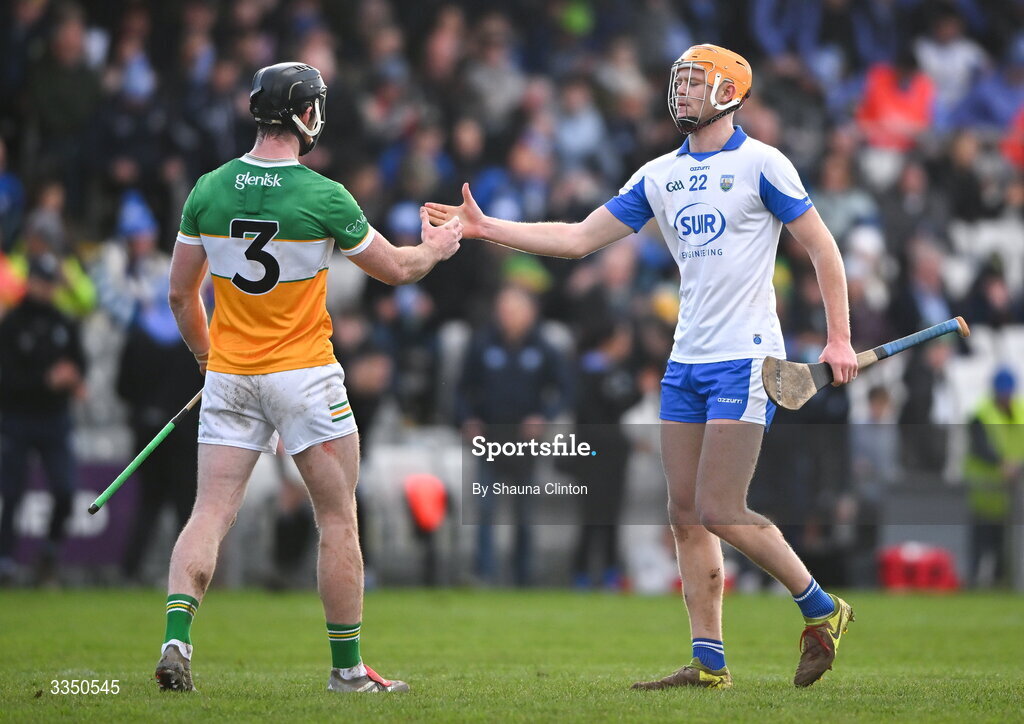 8 February 2026; Sean Walsh of Waterford, right, and Ben Conneely of Offaly shake hands after the Allianz Hurling League Division 1A match between Waterford and Offaly at Azzuri Walsh Park in Waterford. Photo by Shauna Clinton/Sportsfile