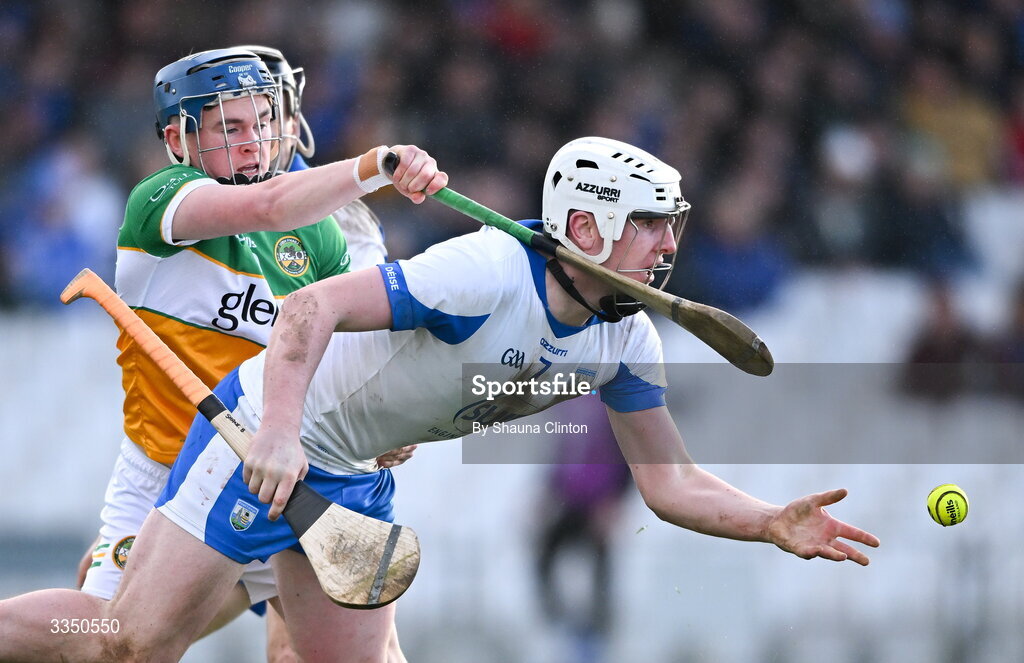 8 February 2026; Shane Bennett of Waterford is tackled by Ter Guinan of Offaly during the Allianz Hurling League Division 1A match between Waterford and Offaly at Azzuri Walsh Park in Waterford. Photo by Shauna Clinton/Sportsfile