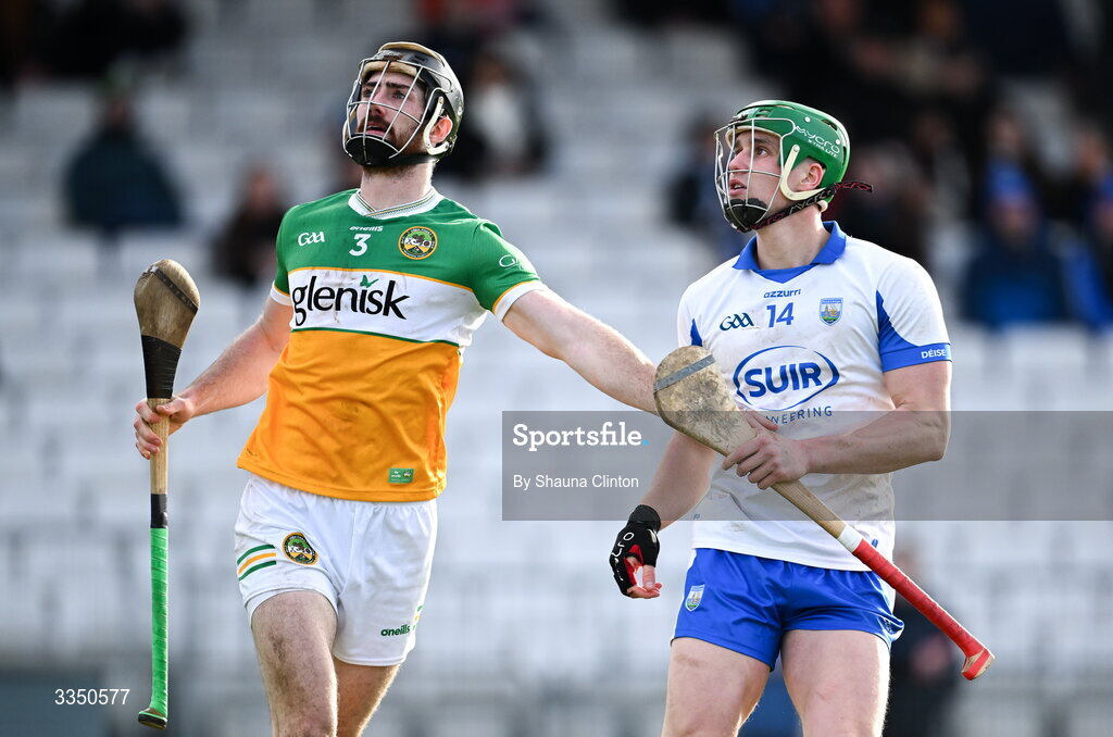 8 February 2026; Ben Conneely of Offaly and Michael Kelly of Waterford watch a score go over during the Allianz Hurling League Division 1A match between Waterford and Offaly at Azzuri Walsh Park in Waterford. Photo by Shauna Clinton/Sportsfile