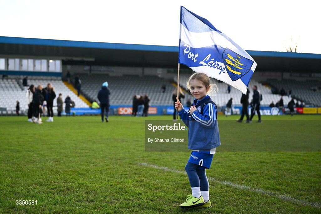 8 February 2026; Waterford supporter Fiadh O'Brien celebrates after her side's victory in the Allianz Hurling League Division 1A match between Waterford and Offaly at Azzuri Walsh Park in Waterford. Photo by Shauna Clinton/Sportsfile