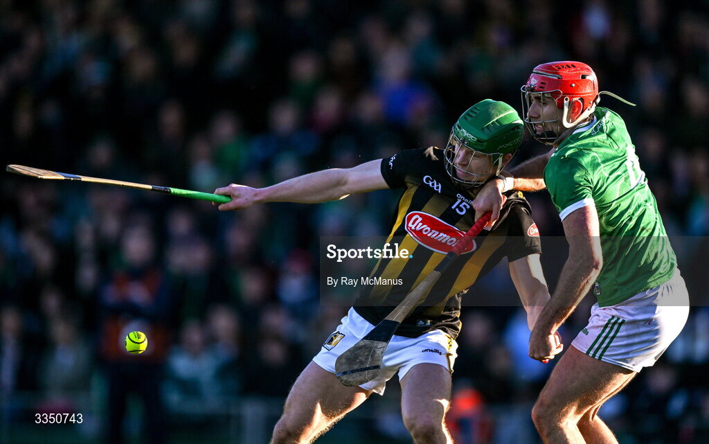8 February 2026; Mossy Keoghan of Kilkenny is tackled by Barry Nash of Limerick during the Allianz Hurling League Division 1A match between Limerick and Kilkenny at TUS Gaelic Grounds in Limerick. Photo by Ray McManus/Sportsfile