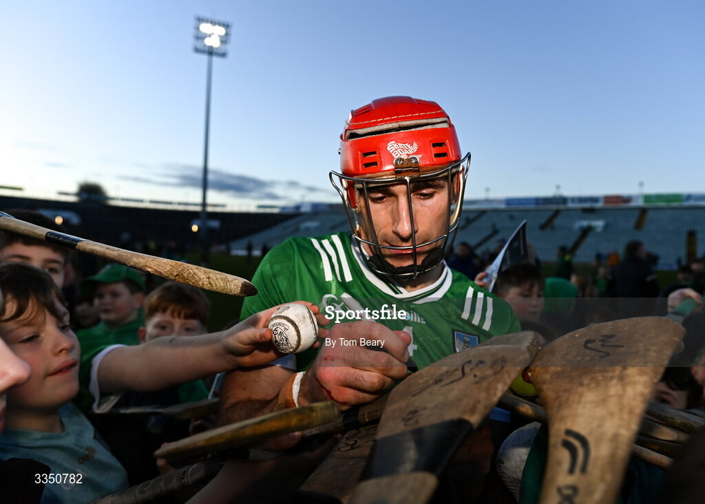 8 February 2026; Barry Nash of Limerick signs his autograph on a hurl after the Allianz Hurling League Division 1A match between Limerick and Kilkenny at TUS Gaelic Grounds in Limerick. Photo by Tom Beary/Sportsfile