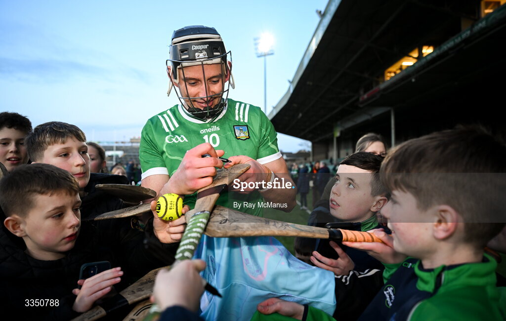 8 February 2026; Gearoid Hegarty of Limerick signs autographs after the Allianz Hurling League Division 1A match between Limerick and Kilkenny at TUS Gaelic Grounds in Limerick. Photo by Ray McManus/Sportsfile