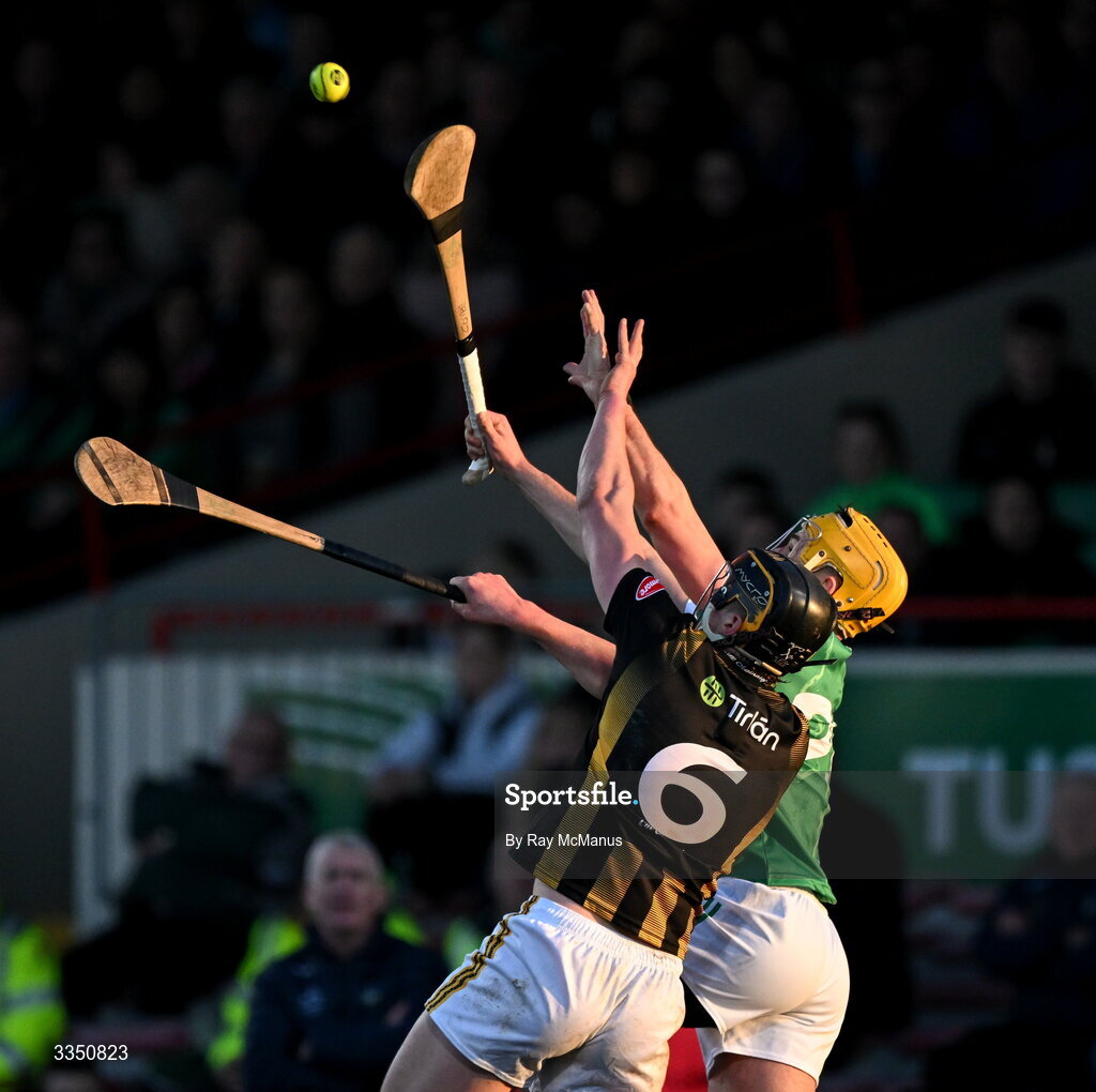 8 February 2026; Darragh Corcoran of Kilkenny in action against Cathal O'Neill of Limerick during the Allianz Hurling League Division 1A match between Limerick and Kilkenny at TUS Gaelic Grounds in Limerick. Photo by Ray McManus/Sportsfile