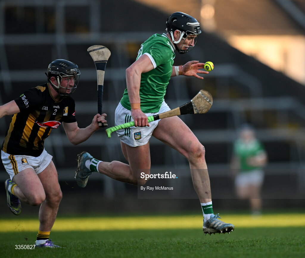 8 February 2026; Gearoid Hegarty of Limerick is tackled by Mikey Butler of Kilkenny during the Allianz Hurling League Division 1A match between Limerick and Kilkenny at TUS Gaelic Grounds in Limerick. Photo by Ray McManus/Sportsfile