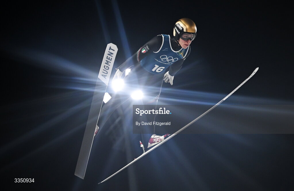 8 February 2026; Giovanni Bresadola of Italy in action in the Men's Ski Jumping normal hill training during day two of the Milano Cortina 2026 Winter Olympics at Predazzo Ski Jumping Stadium in Predazzo, Italy. Photo by David Fitzgerald/Sportsfile