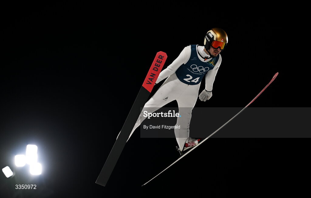 8 February 2026; Sandro Hauswirth of Team Switzerland in action in the Men's Ski Jumping normal hill training during day two of the Milano Cortina 2026 Winter Olympics at Predazzo Ski Jumping Stadium in Predazzo, Italy. Photo by David Fitzgerald/Sportsfile