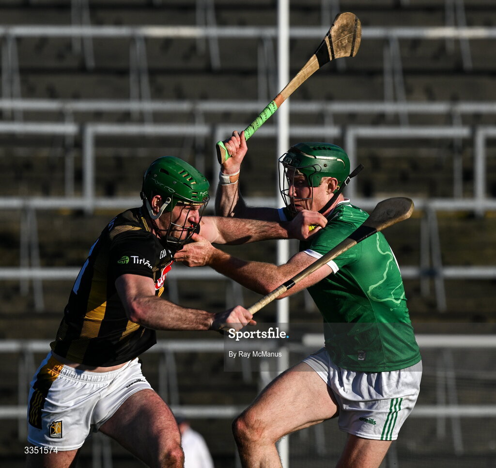 8 February 2026; Eoin Cody of Kilkenny is tackled by William O'Donoghue of Limerick during the Allianz Hurling League Division 1A match between Limerick and Kilkenny at TUS Gaelic Grounds in Limerick. Photo by Ray McManus/Sportsfile