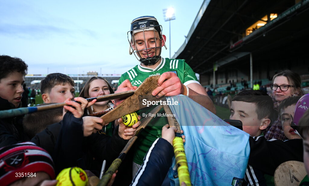 8 February 2026; Gearoid Hegarty of Limerick signs autographs after the Allianz Hurling League Division 1A match between Limerick and Kilkenny at TUS Gaelic Grounds in Limerick. Photo by Ray McManus/Sportsfile