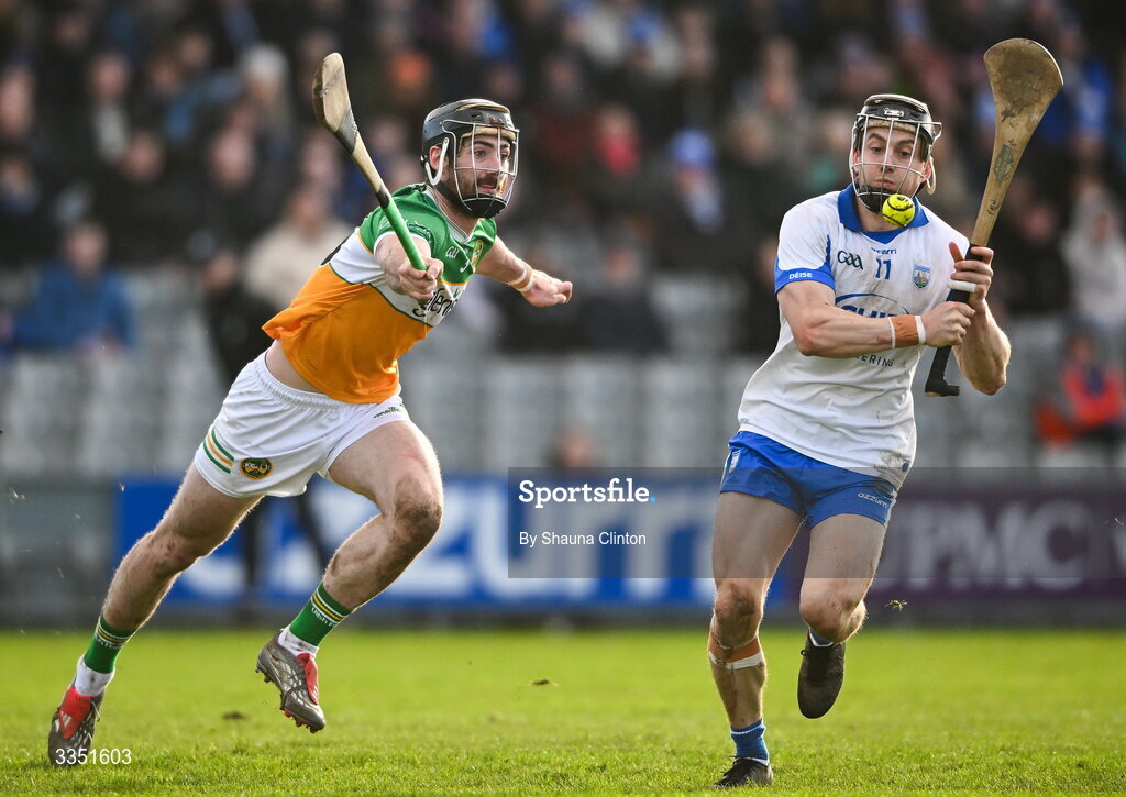 8 February 2026; Jamie Barron of Waterford in action against Ben Conneely of Offaly during the Allianz Hurling League Division 1A match between Waterford and Offaly at Azzuri Walsh Park in Waterford. Photo by Shauna Clinton/Sportsfile