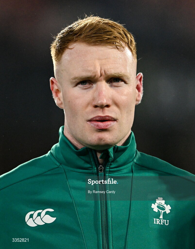 6 February 2026; Ciarán Frawley of Ireland XV before the representative fixture rugby union match between Ireland XV and England A at Thomond Park in Limerick. Photo by Ramsey Cardy/Sportsfile