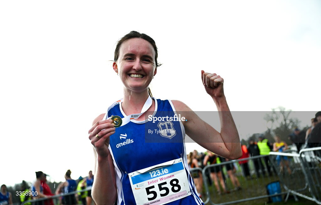 15 February 2026; Women's intermediate 4000m winner Fiona Hawkins of Dublin City Harriers AC with her medal during the 123.ie National Intermediate, Masters & Juvenile B Cross Country Championships at the Sport Ireland National Cross Country Course in Abbottstown, Dublin. Photo by Tyler Miller/Sportsfile