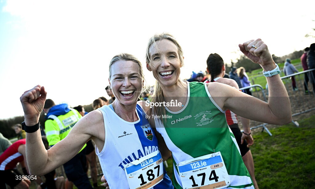 15 February 2026; Maire-Triona Keane of Tullamore Harriers A.C., Offaly, left, and Anne Watkins of St. Joseph's A.C., Kilkenny, after competing in the women's intermediate 4000m during the 123.ie National Intermediate, Masters & Juvenile B Cross Country Championships at the Sport Ireland National Cross Country Course in Abbottstown, Dublin. Photo by Tyler Miller/Sportsfile