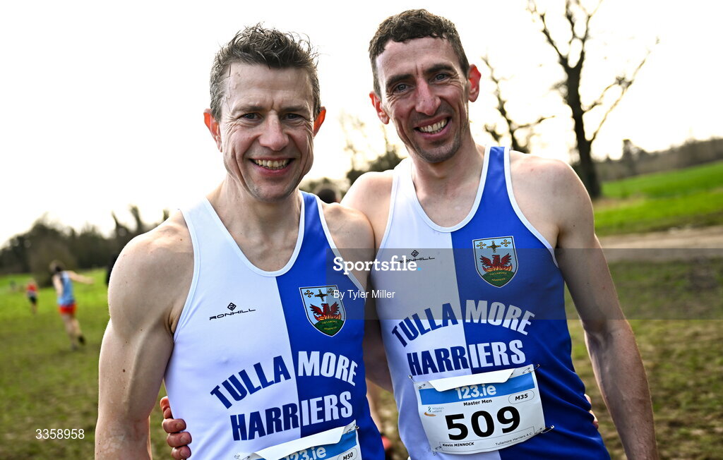 15 February 2026; Barry Minnock, left, and Kevin Minnock of Tullamore Harriers A.C., Offaly, before competing in the men's masters 6000m during the 123.ie National Intermediate, Masters & Juvenile B Cross Country Championships at the Sport Ireland National Cross Country Course in Abbottstown, Dublin. Photo by Tyler Miller/Sportsfile