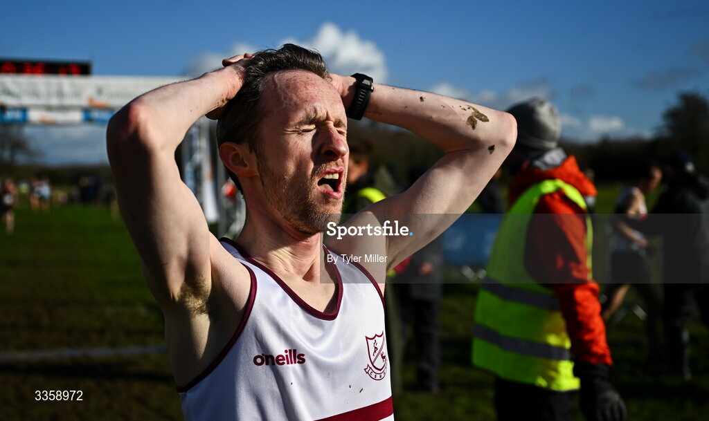 15 February 2026; James Daly of Civil Service Harriers A.C., Dublin, after competing in the men's masters 6000m during the 123.ie National Intermediate, Masters & Juvenile B Cross Country Championships at the Sport Ireland National Cross Country Course in Abbottstown, Dublin. Photo by Tyler Miller/Sportsfile