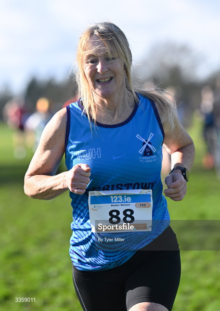 15 February 2026; Muriel Bermingham of Garristown Flyers A.C., Dublin, competes in the women's masters 3000m during the 123.ie National Intermediate, Masters & Juvenile B Cross Country Championships at the Sport Ireland National Cross Country Course in Abbottstown, Dublin. Photo by Tyler Miller/Sportsfile
