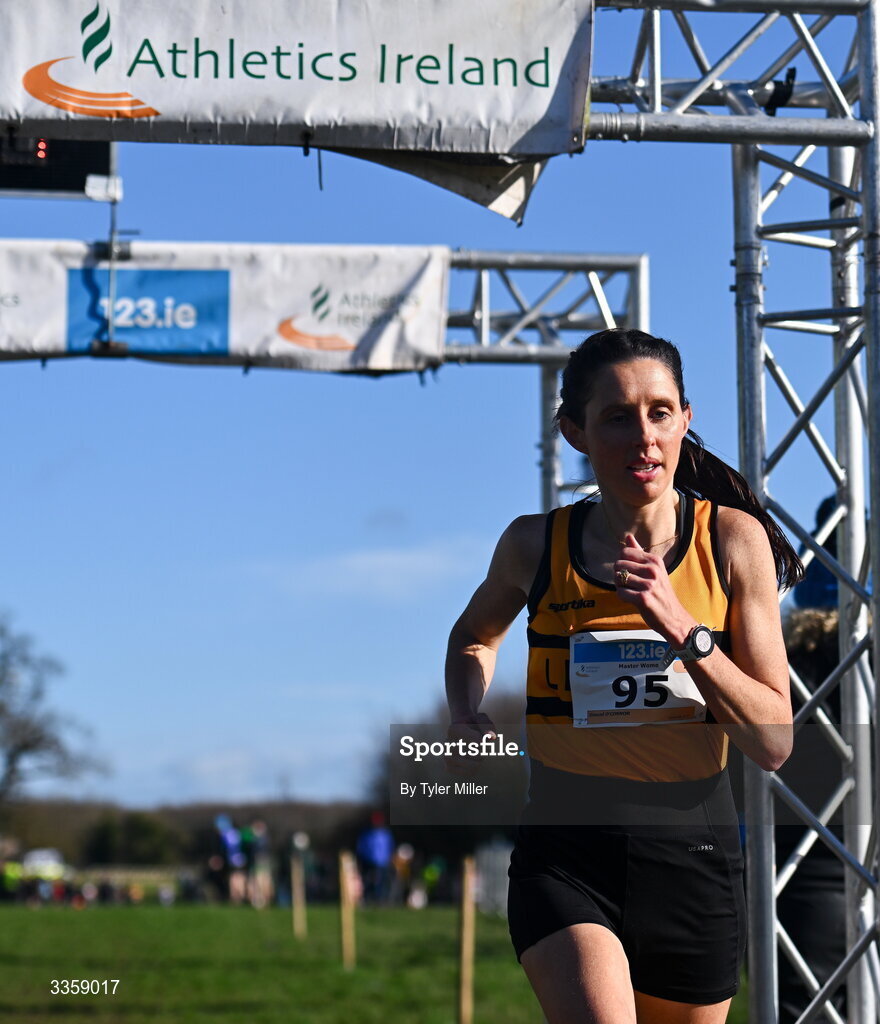 15 February 2026; Sinead O'Connor of Leevale A.C., Cork, crosses the finish line to win the women's masters 3000m during the 123.ie National Intermediate, Masters & Juvenile B Cross Country Championships at the Sport Ireland National Cross Country Course in Abbottstown, Dublin. Photo by Tyler Miller/Sportsfile