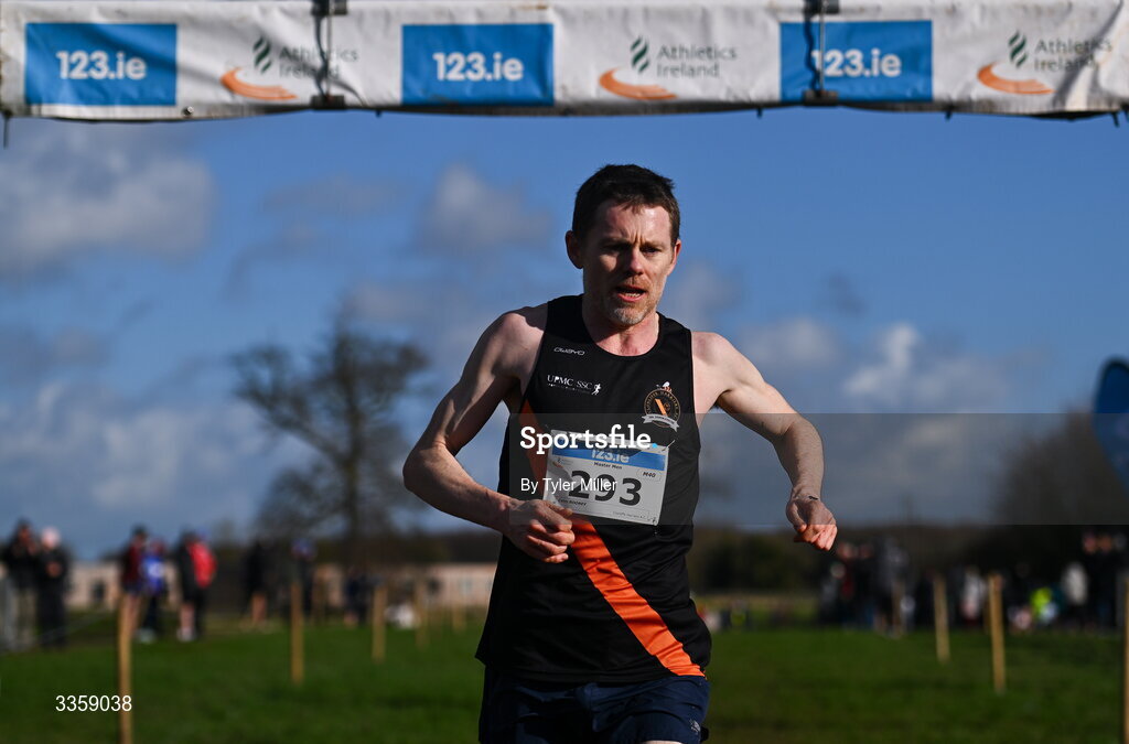 15 February 2026; Colm Rooney of Clonliffe Harriers A.C., Dublin, crosses the finish line to win the men's masters 6000m during the 123.ie National Intermediate, Masters & Juvenile B Cross Country Championships at the Sport Ireland National Cross Country Course in Abbottstown, Dublin. Photo by Tyler Miller/Sportsfile
