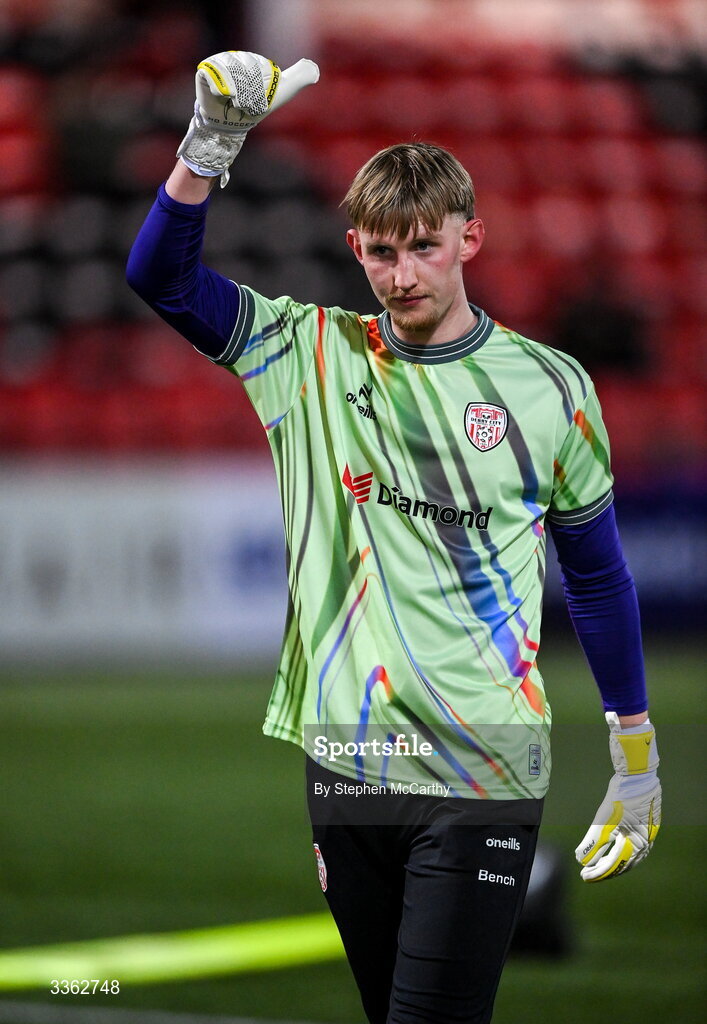 20 February 2026; Derry City goalkeeper Eddie Beach warms up before the SSE Airtricity Men's Premier Division match between Derry City and Bohemians at The Ryan McBride Brandywell Stadium in Derry. Photo by Stephen McCarthy/Sportsfile