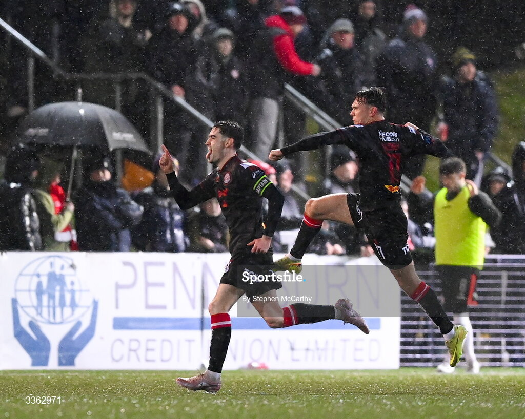 20 February 2026; Dawson Devoy of Bohemians celebrates with team-mate Dayle Rooney, right, after scoring their side's first goal during the SSE Airtricity Men's Premier Division match between Derry City and Bohemians at The Ryan McBride Brandywell Stadium in Derry. Photo by Stephen McCarthy/Sportsfile