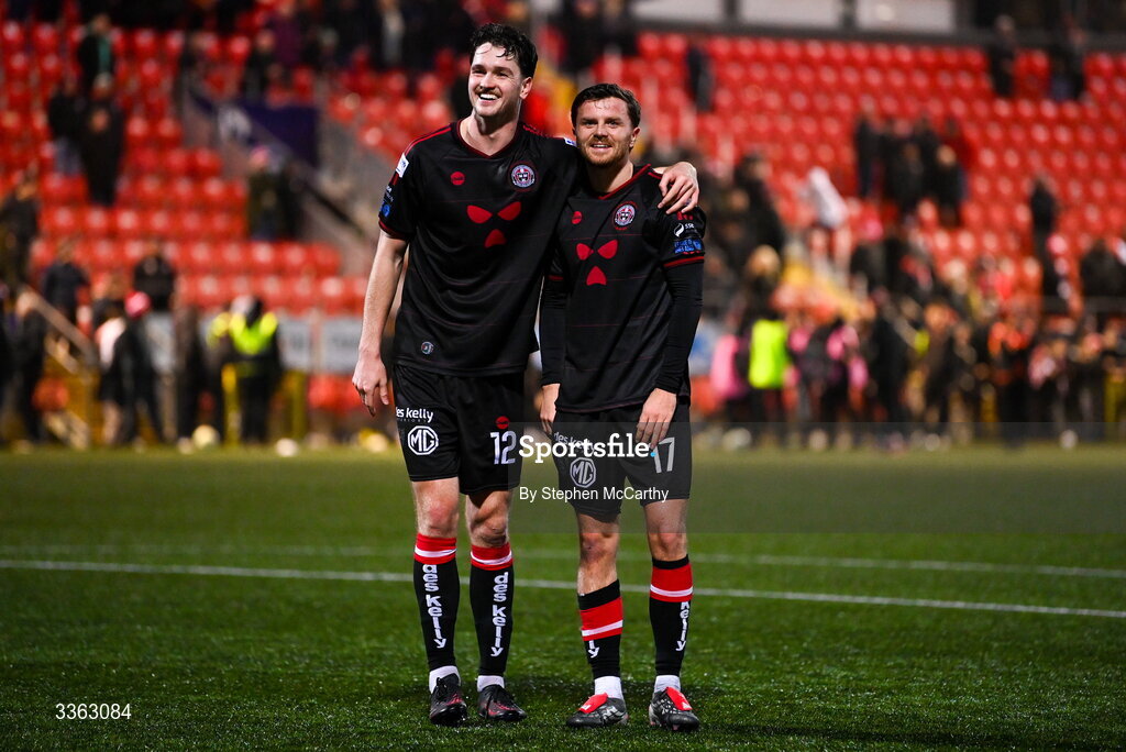 20 February 2026; Patrick Hickey, left, and Adam McDonnell of Bohemians celebrate after the SSE Airtricity Men's Premier Division match between Derry City and Bohemians at The Ryan McBride Brandywell Stadium in Derry. Photo by Stephen McCarthy/Sportsfile