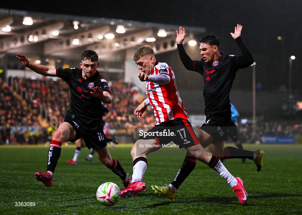20 February 2026; Josh Thomas of Derry City in action against Darragh Power, left, and Dayle Rooney of Bohemians during the SSE Airtricity Men's Premier Division match between Derry City and Bohemians at The Ryan McBride Brandywell Stadium in Derry. Photo by Stephen McCarthy/Sportsfile