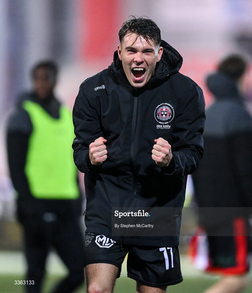 20 February 2026; Dayle Rooney of Bohemians celebrates after the SSE Airtricity Men's Premier Division match between Derry City and Bohemians at The Ryan McBride Brandywell Stadium in Derry. Photo by Stephen McCarthy/Sportsfile
