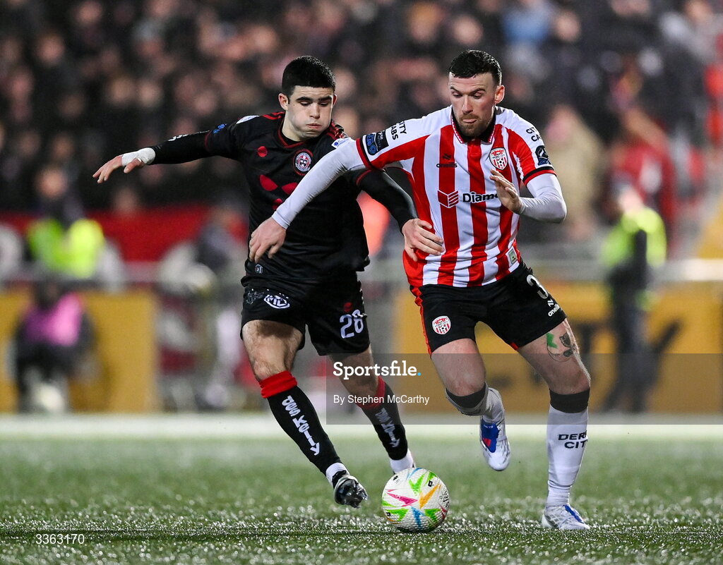 20 February 2026; Patrick McClean of Derry City in action against Hugh Martin of Bohemians during the SSE Airtricity Men's Premier Division match between Derry City and Bohemians at The Ryan McBride Brandywell Stadium in Derry. Photo by Stephen McCarthy/Sportsfile