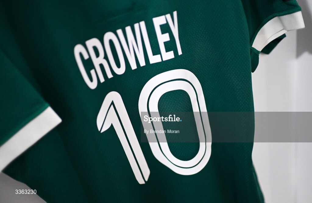 21 February 2026; The jersey of Jack Crowley in the Ireland dressingroom before the Guinness 6 Nations Rugby Championship match between England and Ireland at the Allianz Stadium in Twickenham, England. Photo by Brendan Moran/Sportsfile