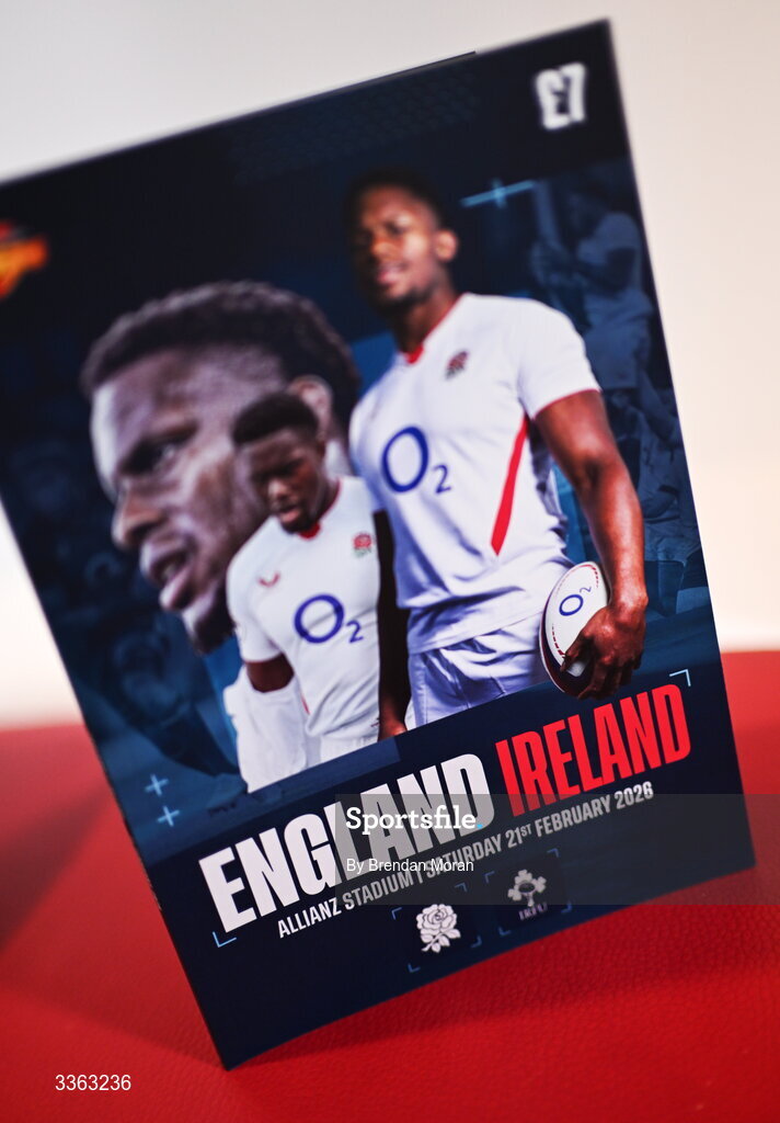 21 February 2026; The match programme in the Ireland dressingroom before the Guinness 6 Nations Rugby Championship match between England and Ireland at the Allianz Stadium in Twickenham, England. Photo by Brendan Moran/Sportsfile