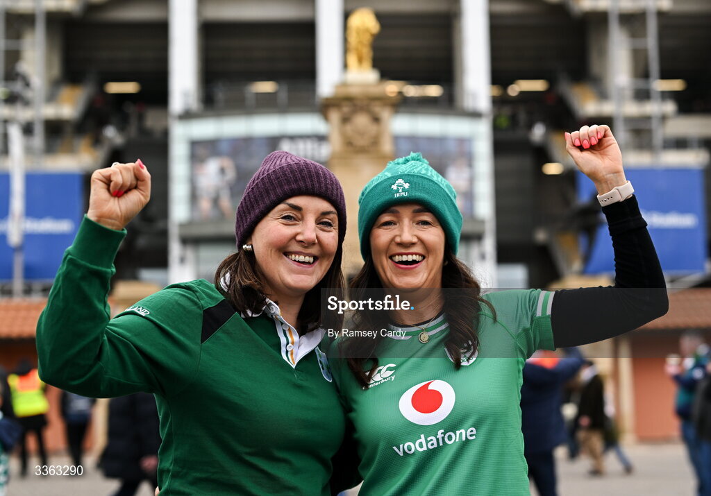 21 February 2026; Ireland supporters Lorraine Collins and Mary Irvine, from Strokestown, Roscommon, before the Guinness 6 Nations Rugby Championship match between England and Ireland at the Allianz Stadium in Twickenham, England. Photo by Ramsey Cardy/Sportsfile