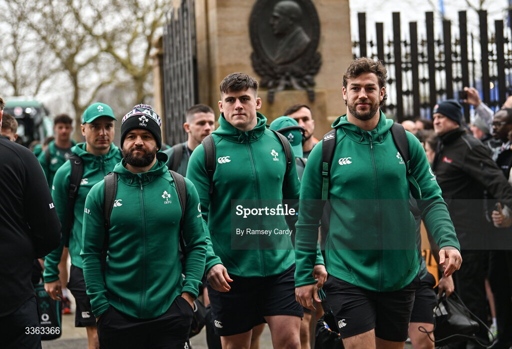 21 February 2026; Ireland captain Caelan Doris, right, and teammates Jamison Gibson-Park, left, and Dan Sheehan arrive before the Guinness 6 Nations Rugby Championship match between England and Ireland at the Allianz Stadium in Twickenham, England. Photo by Ramsey Cardy/Sportsfile