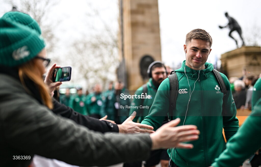 21 February 2026; Ireland's Jack Crowley arrives before the Guinness 6 Nations Rugby Championship match between England and Ireland at the Allianz Stadium in Twickenham, England. Photo by Ramsey Cardy/Sportsfile