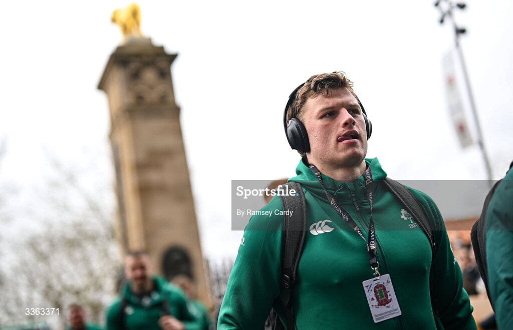 21 February 2026; Ireland's Cian Prendergast arrives before the Guinness 6 Nations Rugby Championship match between England and Ireland at the Allianz Stadium in Twickenham, England. Photo by Ramsey Cardy/Sportsfile