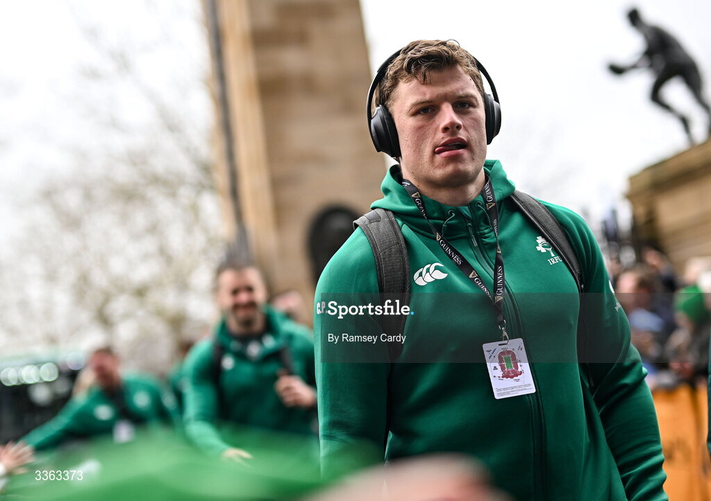 21 February 2026; Ireland's Cian Prendergast arrives before the Guinness 6 Nations Rugby Championship match between England and Ireland at the Allianz Stadium in Twickenham, England. Photo by Ramsey Cardy/Sportsfile