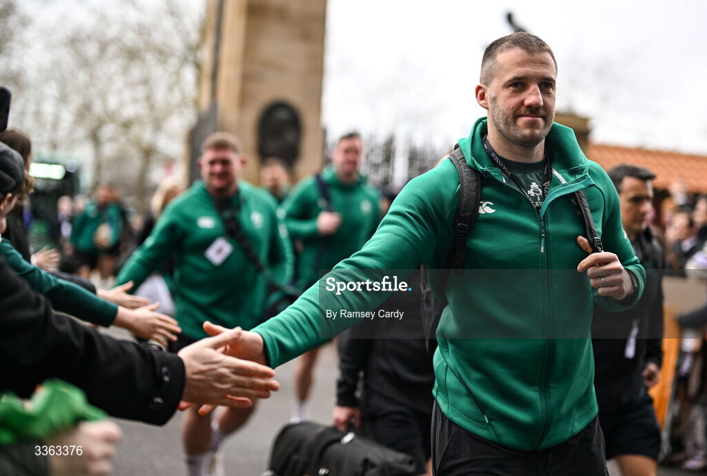 21 February 2026; Ireland's Stuart McCloskey arrives before the Guinness 6 Nations Rugby Championship match between England and Ireland at the Allianz Stadium in Twickenham, England. Photo by Ramsey Cardy/Sportsfile