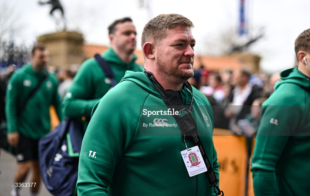 21 February 2026; Ireland's Tadhg Furlong arrives before the Guinness 6 Nations Rugby Championship match between England and Ireland at the Allianz Stadium in Twickenham, England. Photo by Ramsey Cardy/Sportsfile