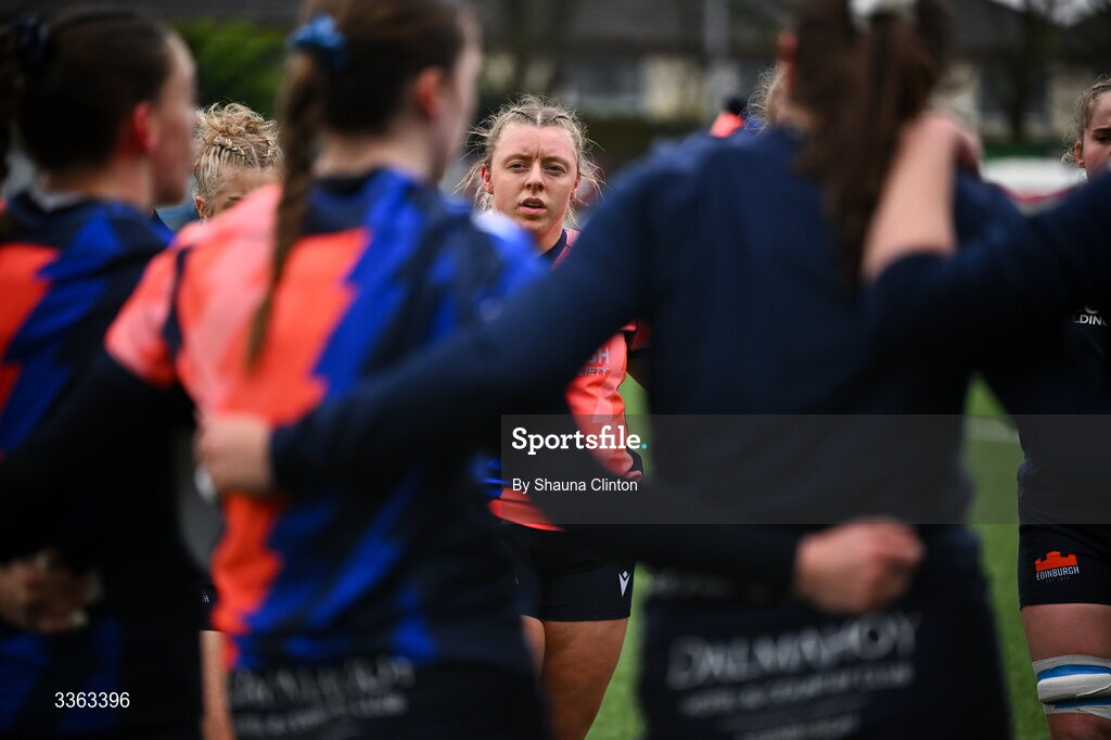21 February 2026; Edinburgh players huddle during the warm-up before the Celtic Challenge Round 8 match between Clovers and Edinburgh Rugby at Dexcom Stadium in Galway. Photo by Shauna Clinton/Sportsfile