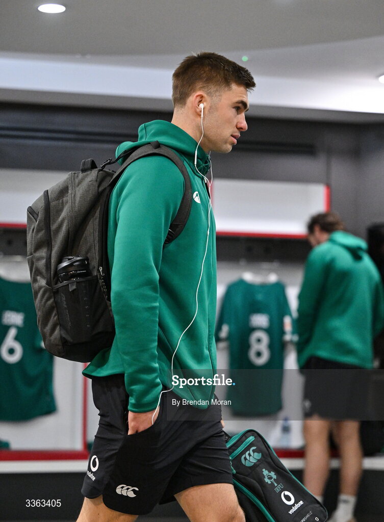 21 February 2026; Jack Crowley of Ireland arrives in the dressing room before the Guinness 6 Nations Rugby Championship match between England and Ireland at the Allianz Stadium in Twickenham, England. Photo by Brendan Moran/Sportsfile