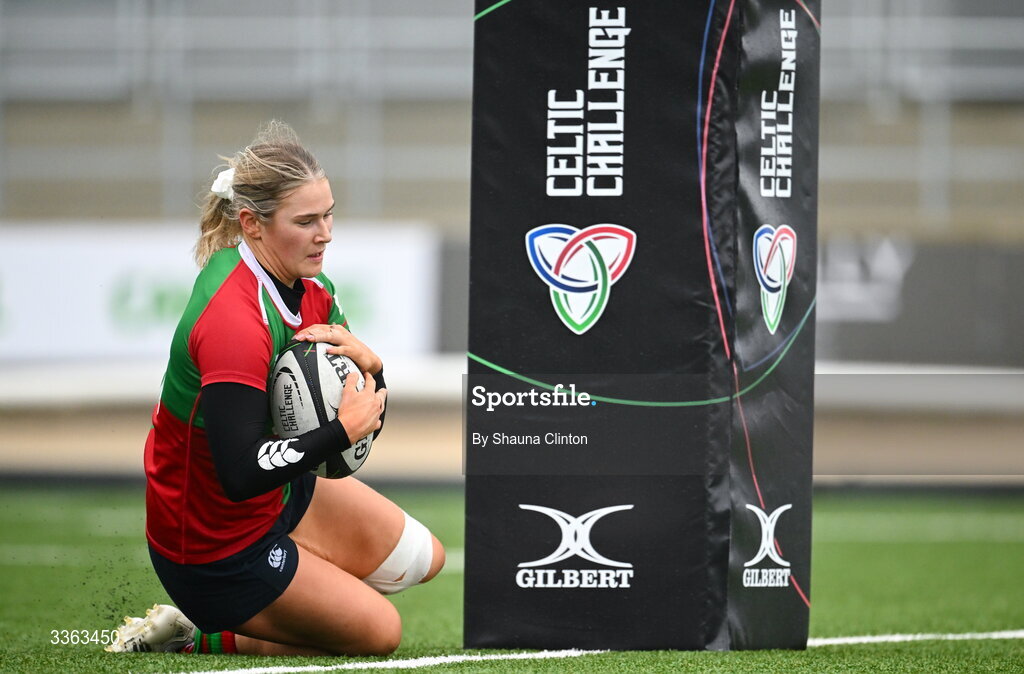 21 February 2026; Aoife Corey of Clovers scores her side's first try during the Celtic Challenge Round 8 match between Clovers and Edinburgh Rugby at Dexcom Stadium in Galway. Photo by Shauna Clinton/Sportsfile