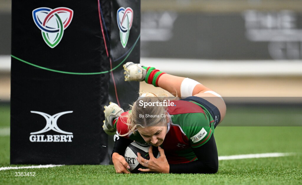 21 February 2026; Aoife Corey of Clovers scores her side's first try during the Celtic Challenge Round 8 match between Clovers and Edinburgh Rugby at Dexcom Stadium in Galway. Photo by Shauna Clinton/Sportsfile