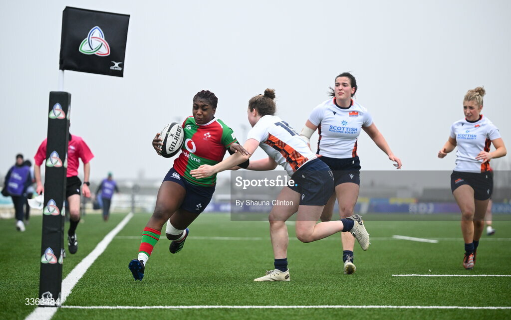 21 February 2026; Chisom Ugwueru of Clovers scores her side's third try despite the efforts of Lucy MacRae of Edinburgh during the Celtic Challenge Round 8 match between Clovers and Edinburgh Rugby at Dexcom Stadium in Galway. Photo by Shauna Clinton/Sportsfile