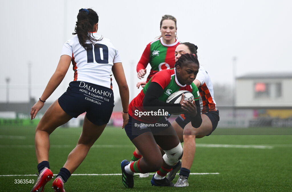 21 February 2026; Chisom Ugwueru of Clovers dives over to score her side's fourth try during the Celtic Challenge Round 8 match between Clovers and Edinburgh Rugby at Dexcom Stadium in Galway. Photo by Shauna Clinton/Sportsfile