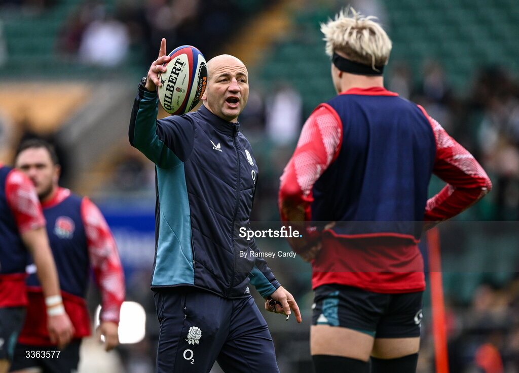 21 February 2026; England head coach Steve Borthwick, centre, and Henry Pollock, right, before the Guinness 6 Nations Rugby Championship match between England and Ireland at the Allianz Stadium in Twickenham, England. Photo by Ramsey Cardy/Sportsfile